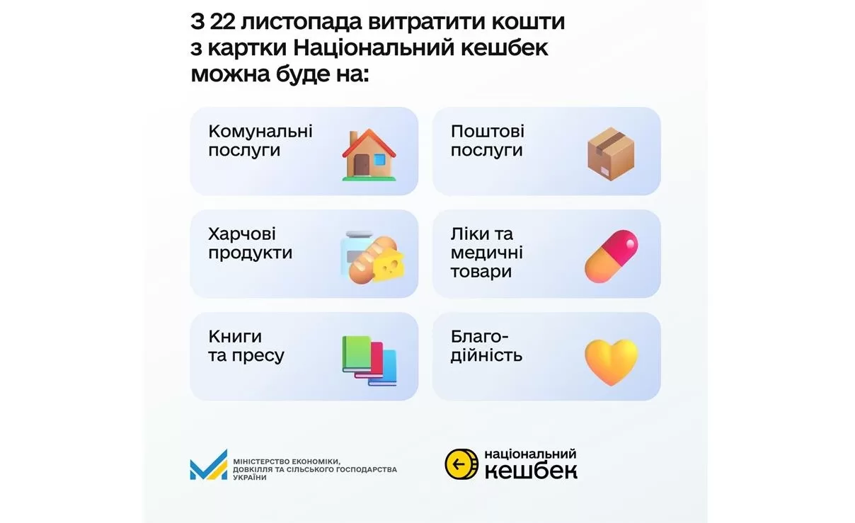 У Мінекономіки повідомили, що з 22 листопада оновлено категорії товарів і послуг, на які можна витрачати кошти, накопичені в рамках програми «Національний Кешбек», зазначається в Міністерство економіки, екології та сільського господарства України. Необхідність змін пояснюється синхронізацією з державною програмою «Зимова підтримка».