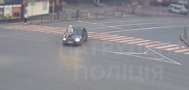 Тернопіль Містом їде автомобіль Dacia, а на капоті сидить чоловік. Це не зйомки фільму, а реальне життя Файного Міста. Опубліковано відповідне відео патрульної поліції Тернопільської області.