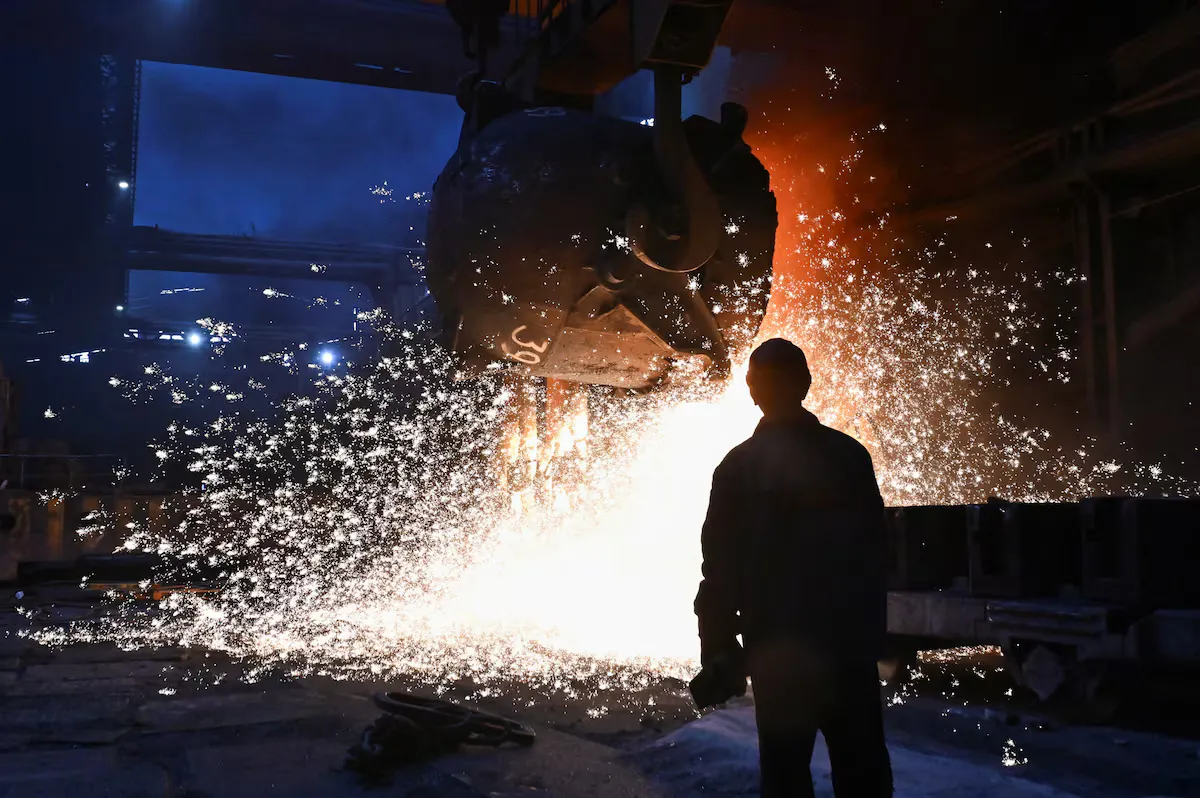 Працівник захисного одягу тане сталь на металургійному заводі Запоріжії, одному з найбільших сталевих заводів у країні, у Запорозі, Україна, четвер, 13 лютого 2025 р.